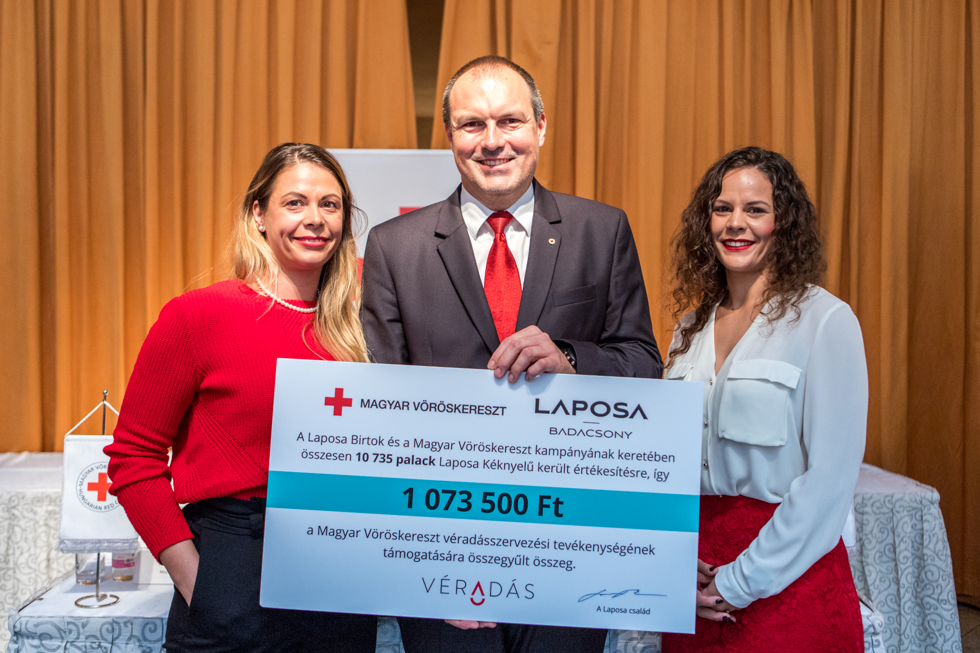 A rendezvény zárásaként a badacsonyi Laposa Birtok borászai átadták a Magyar Vöröskeresztnek azt a 1.073.500, forint összegű adományt, mely a kampányban résztvevő 2017-es Laposa Kéknyelű értékesítéséből folyt be. A társadalmi célú kampányban minden palack 2017-es Laposa Kéknyelű eladásából a Laposa Birtok 100 forinttal támogatja a Magyar Vöröskereszt véradás kampányát a 2018-as és a 2019-es év során.